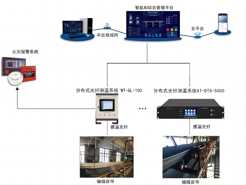 微探科技輸煤皮帶溫度監(jiān)測系統(tǒng)由火災(zāi)探測系統(tǒng)智能分布式光纖測溫主機(jī)、感溫光纖、監(jiān)控計(jì)算機(jī)、監(jiān)控管理軟件和消防系統(tǒng)聯(lián)動設(shè)備等組成,可以實(shí)時監(jiān)測輸煤皮帶兩側(cè)溫度變化,發(fā)現(xiàn)火災(zāi)隱患及時聯(lián)動火災(zāi)報警設(shè)備。搭配本公司智能AI綜合管理平臺,可在監(jiān)控計(jì)算機(jī)上直觀展現(xiàn)整個礦(廠)區(qū)所有輸煤皮帶的監(jiān)控全貌,形象標(biāo)注溫度異常位置,便于災(zāi)情撲救以及人員疏散。