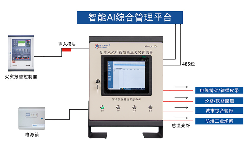 河北微探科技有限公司自主研發(fā)設(shè)計(jì)的WT-GL-100C分布式光纖線型感溫火災(zāi)探測(cè)器,是以GB 16280-2014《線型感溫火災(zāi)探測(cè)器》為設(shè)計(jì)依據(jù),運(yùn)用OTDR 技術(shù)和 Raman 散射光對(duì)溫度敏銳特性,結(jié)合高頻脈沖激光、波分復(fù)用、高頻信號(hào)采集及微弱信號(hào)處理等技術(shù)來(lái)探測(cè)出光纖不同位置的溫度變化,不僅能穩(wěn)定準(zhǔn)確地預(yù)報(bào)火警,還能準(zhǔn)確定位火情發(fā)生位置。鑒于光纖本身不導(dǎo)電的特性,該產(chǎn)品更適合應(yīng)用于易燃、易爆等危險(xiǎn)區(qū)域和有強(qiáng)電磁干擾、腐蝕、高溫和防爆要求的工業(yè)項(xiàng)目的溫度探測(cè)。