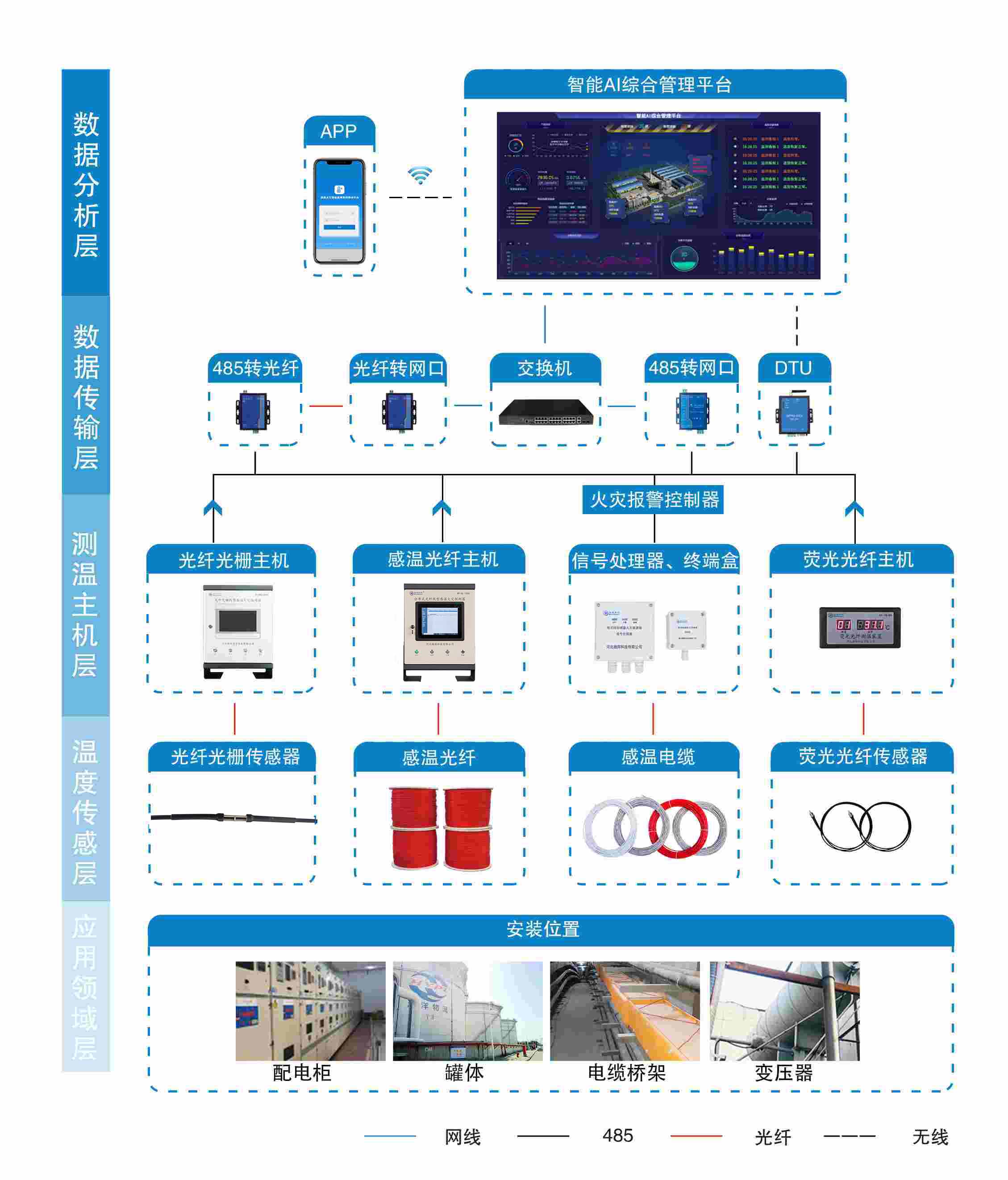 (3)電纜溫度監(jiān)測(cè)系統(tǒng):通過(guò)敷設(shè)在電纜表面的感溫光纖,直接測(cè)量電力電纜的表面溫度,通過(guò)光纖測(cè)溫主機(jī)將電纜溫度數(shù)據(jù)傳給智能AI綜合管理平臺(tái),實(shí)現(xiàn)電纜溫度實(shí)時(shí)監(jiān)測(cè),出現(xiàn)故障及時(shí)告警,保障設(shè)備穩(wěn)定運(yùn)行。