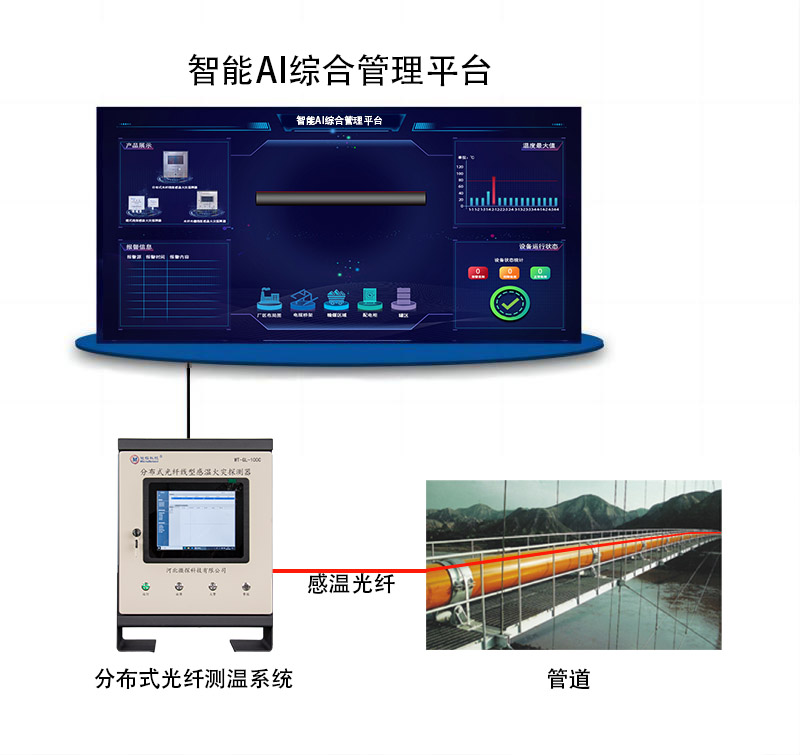 微探科技管道泄漏監(jiān)測(cè)系統(tǒng)由分布式光纖測(cè)溫主機(jī)、相應(yīng)的測(cè)溫光纜及附件組成,對(duì)管道的溫度進(jìn)行連續(xù)線型實(shí)時(shí)在線監(jiān)測(cè),從而監(jiān)測(cè)管道泄漏情況。整套監(jiān)測(cè)系統(tǒng)通過其測(cè)溫主機(jī)通訊接口與智能AI綜合管理平臺(tái)連接,并負(fù)責(zé)向其提供報(bào)警信息及運(yùn)行和故障信號(hào)。