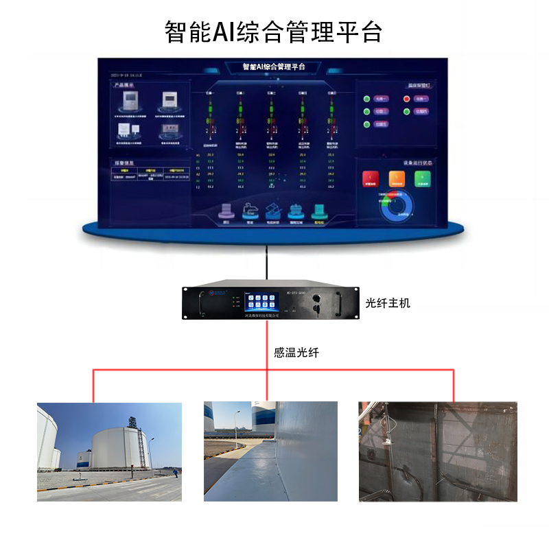 微探科技LNG儲罐監(jiān)測系統(tǒng)由光纖測溫主機、測溫光纖(不銹鋼外護套)、監(jiān)控管理軟件及相關(guān)附件組成。測溫光纖環(huán)形敷設(shè)于外層罐體內(nèi)壁,通過對溫度的監(jiān)測,判斷珍珠巖層是否發(fā)生沉降,同時可對儲罐承臺溫度進行監(jiān)測,當(dāng)儲罐出現(xiàn)溫度異常時,測溫主機能進行數(shù)據(jù)采集,并進行預(yù)警,報警。同時將實時數(shù)據(jù)上傳到智能AI綜合管理平臺,工作人員可以及時對報警事件進行排查、排除處理。