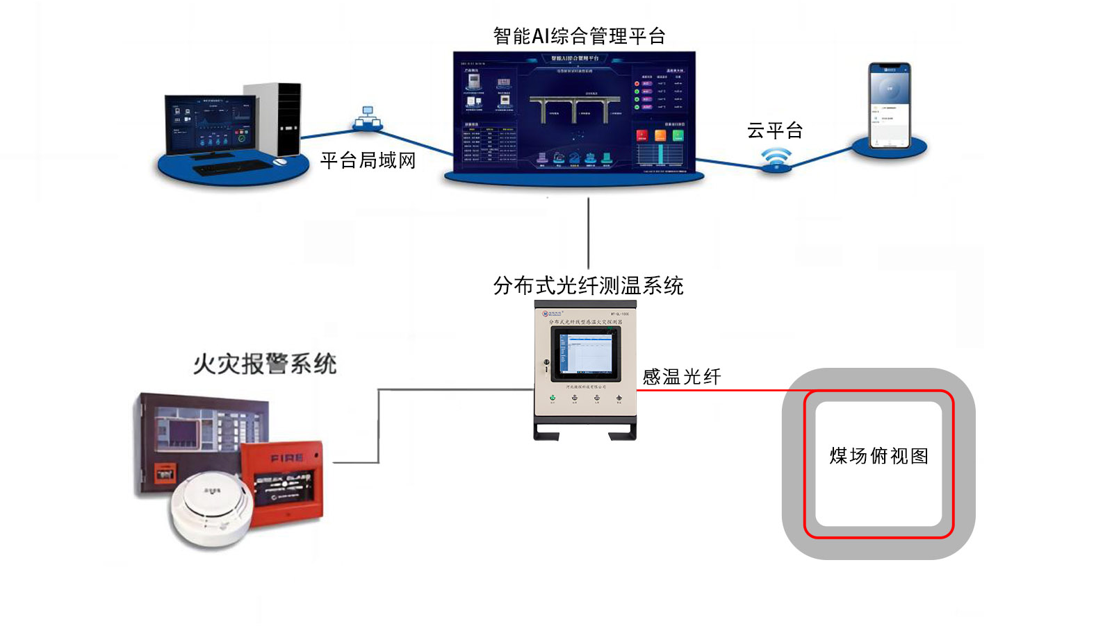 微探科技煤場溫度監(jiān)測系統(tǒng)由分布式光纖測溫主機、感溫光纖、監(jiān)控計算機、監(jiān)控管理軟件、與消防系統(tǒng)聯(lián)動的設(shè)備等組成。