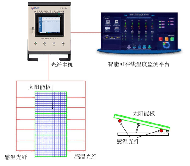 微探科技光伏板溫度監(jiān)測系統(tǒng)由光纖測溫主機、測溫光纖、監(jiān)控管理軟件及相關(guān)輔件組成,它基于OTDR技術(shù)和Raman散射光對溫度敏感的特性沖激光、波分復(fù)用、高頻信號采集及微弱信號處理等先進技術(shù),能準確探測光伏板所有易發(fā)熱點,結(jié)合高頻脈的溫度,并識別溫度異常點的具體位置。通過將感溫光纖安裝于光伏板背面,實現(xiàn)分布式的測量。具有實時在線、測溫精度高、不受電磁干擾等優(yōu)點。可及時發(fā)現(xiàn)光伏板溫度異常點、潛在缺陷與風(fēng)險,提高光伏板運維質(zhì)量,輔助電系統(tǒng)運行。