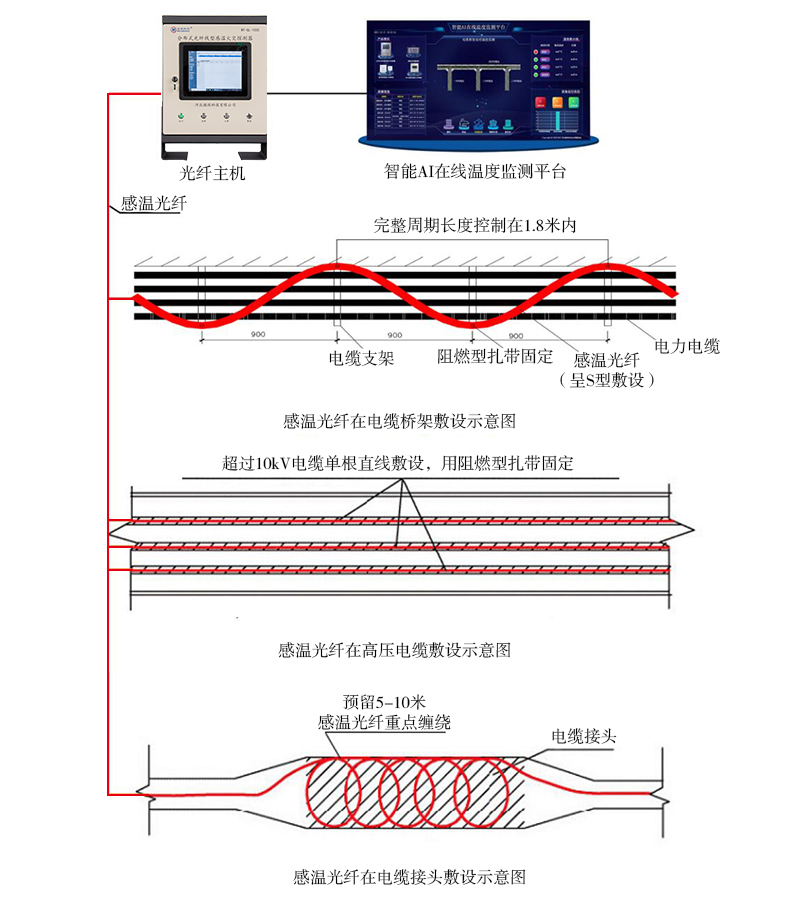 微探科技電纜橋架溫度監(jiān)測系統(tǒng)由光纖測溫主機(jī)、測溫光纖、監(jiān)控管理軟件及相關(guān)附件組成,它基于OTDR技術(shù)和Raman散射光對(duì)溫度敏感的特性,結(jié)合高頻脈沖激光、波分復(fù)用、高頻信號(hào)采集及微弱信號(hào)處理等技術(shù),能準(zhǔn)確探測高壓電纜沿線所有測量點(diǎn)的溫度,并識(shí)別溫度異常點(diǎn)的具體位置。通過將感溫光纖沿電纜敷設(shè)于表面,實(shí)現(xiàn)分布式測量。具有實(shí)時(shí)在線、測溫精度高、不受電磁干擾等優(yōu)點(diǎn)??杉皶r(shí)發(fā)現(xiàn)電纜溫度異常點(diǎn)、潛在缺陷與風(fēng)險(xiǎn),提高高壓電纜運(yùn)維質(zhì)量,輔助光電系統(tǒng)穩(wěn)定運(yùn)行。