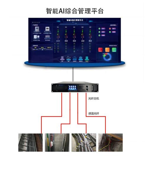本方案主要運(yùn)用光纖測溫主機(jī)、感溫光纖、監(jiān)控管理軟件及相關(guān)附件,光纖測溫主機(jī)基于的OTDR技術(shù)和Raman散射光對溫度敏感的特性,結(jié)合高頻脈沖激光、波分復(fù)用、高頻信號采集及微弱信號處理等技術(shù),通過將感溫光纖敷設(shè)于電纜表面,探測光纖沿線所有測量點(diǎn)的溫度,并識別溫度異常點(diǎn)的具體位置??蓪?shí)現(xiàn)長距離的溫度連續(xù)測量,無遺漏點(diǎn)。一旦電纜某一位置發(fā)生溫度異常,系統(tǒng)可捕捉溫度數(shù)據(jù),并將監(jiān)測的溫度數(shù)據(jù)實(shí)時(shí)上傳到智能AI綜合管理平臺,且可與其他火災(zāi)報(bào)警設(shè)備進(jìn)行聯(lián)動(dòng),保障樓宇電力運(yùn)行安全。該系統(tǒng)測溫距離長,且具有本征無源、抗電磁干擾、防雷防爆等優(yōu)勢。